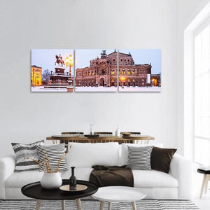 Semperoper In The Winter Time captures the opera house and its equestrian statue in a panoramic snowy cityscape. Cool blues, warm neutrals and touches of golden yellow create a grand, historic and serene evening mood with a quietly cold feel. This panoramic canvas fits well in living rooms, studies, or entryways that highlight architectural scenes.