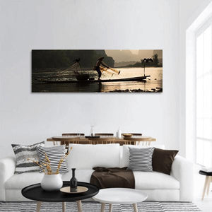 A panoramic scene of a senior fisherman in Guilin, China, casting a net from a boat with cormorant silhouettes and distant mountains. Golden, dark green, gray, and brown tones give the print a serene, atmospheric mood that suits nature-inspired or modern interiors.