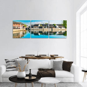 Shantang Ancient Houses Panoramic Canvas Art shows traditional buildings lining a calm canal, with water reflecting the sky and architecture. The photorealistic scene uses blue, white, brown, and green tones for a serene, picturesque atmosphere. Suits modern living rooms or hallways as a place-inspired wall accent.