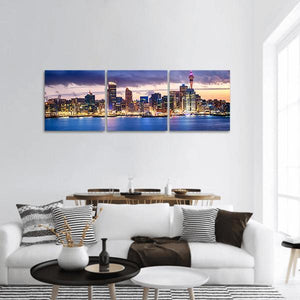 A panoramic view of the Auckland skyline at night, showing illuminated buildings and their reflections on the waterfront. The modern blue, purple and orange palette creates a vibrant, lively urban mood that fits contemporary living rooms and offices.
