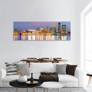 A panoramic canvas print of the Louisville skyline, showing the waterfront, buildings and nighttime city lights. Blues, purples and golds reflect in the water to create a vibrant yet serene modern urban mood that fits contemporary living rooms and offices.