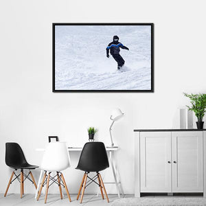 Snowboarder In Motion shows a snowboarder in mid-air over winter snow, capturing a cold, dynamic action moment. The panoramic image uses white, blue, and black tones and works well in modern living spaces or sports-themed rooms as energetic wall decor.