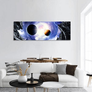 Two planets float before a swirling galaxy, framed by jagged rock formations in a panoramic, symmetrical composition. Rendered in blues, purples, white and orange, the artwork sets a dramatic, cosmic mood suited to modern living rooms, home offices, or minimalist spaces.