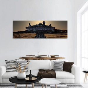 This panoramic canvas depicts a space station on an alien planet — a large, multi-tiered structure on stilts rising from arid, rocky terrain. Glowing blue lights and a setting sun give a futuristic, desolate, and mysterious mood, suited to modern or sci-fi room decor.