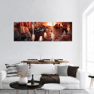 A panoramic sci-fi landscape showing a spaceship landing on an alien planet, with rock formations, a metallic structure, glowing lights, and reflections on water. Rendered in orange, red, brown and gold tones, the scene feels dramatic and surreal and suits modern or sci‑fi‑themed rooms.