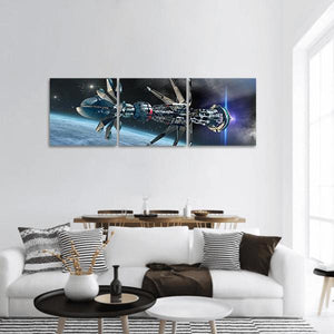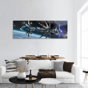 A panoramic canvas depicting a detailed spaceship passing a planet in deep outer space, rendered in blue, silver, black and purple tones. The asymmetrical composition and leading lines draw the eye to the glowing engine and the planet’s atmosphere, creating a futuristic, epic, awe-inspiring mood. Fits well in modern or space-themed rooms and offices as a strong sci‑fi focal piece.