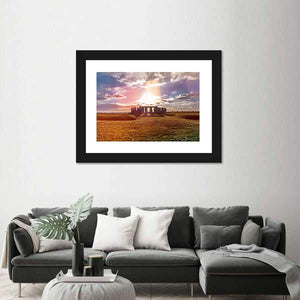 Stonehenge stands silhouetted against a setting sun in this photorealistic panoramic canvas, with golden, orange and pink skies over a grassy field. The scene feels serene and historic with a touch of drama, suitable for modern living rooms or entryways.
