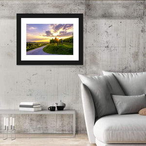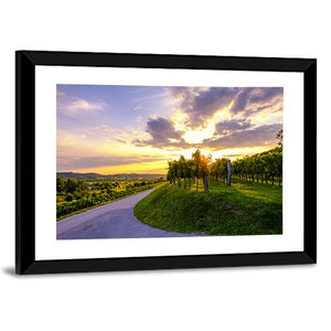Sunset At Vipava Valley Vineyards shows a serene vineyard scene with a winding road and rows of grapevines lit by golden-hour sun. This nature photography print captures hills and the sun shining through trees, offering a warm, peaceful atmosphere that suits living rooms, dining areas, or offices with modern or nature-inspired decor.