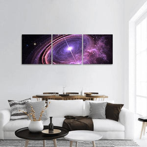 An abstract panoramic depiction of a supermassive star, nebula and galaxy rendered in purple, pink, black and white. Bright core, swirling arms and glowing gas clouds give the scene a vibrant, cosmic energy; X-rays radiate from the center. Suited to modern room decor like living rooms or home offices.