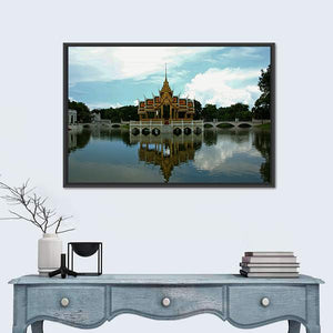 This panoramic canvas of a Thai pavilion and temple beside a calm lake offers a serene, majestic view, with an ornate bridge, trees, and a clear reflection on the water. Its blue, green and gold palette fits living rooms or quiet workspaces. The symmetrical composition highlights the temple’s ornate architecture.