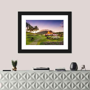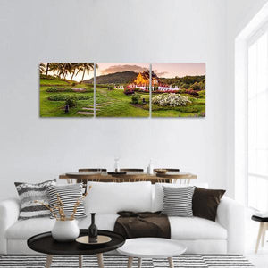 A panoramic canvas of Royal Flora Ratchaphruek Park showing a temple nestled among gardens, palm trees and distant mountains. Soft greens, golds and sunset pinks give a serene, peaceful yet vibrant mood, with a stone pathway and blooming flowers drawing the eye to the illuminated building. Works well in living rooms, hallways, or other calm spaces that favor scenic, realistic landscapes.