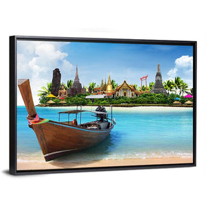 A panoramic, photorealistic canvas of Thailand featuring a tropical island with clear turquoise water, palm trees, traditional temples and a longtail boat. Blue, green, white and gold tones create a serene, exotic, vibrant atmosphere that suits coastal, tropical, or modern decor.