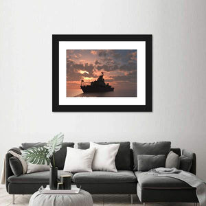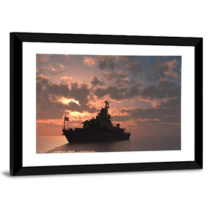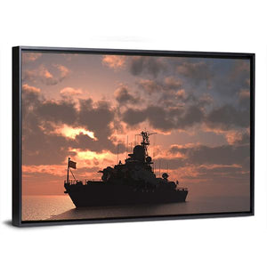 This panoramic canvas depicts a silhouetted battleship at sea at sunset, with a cloudy sky and a flag on the ship. Warm orange and brown tones meet deep grays and black for a cinematic, dramatic yet serene and powerful atmosphere. Suits modern wall decor or a nautical-themed room as a contemplative focal piece.