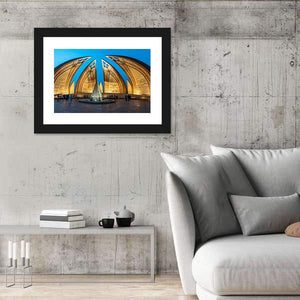 The Pakistan Monument appears in a panoramic, symmetrical view, with its carved golden arches and dome set against a bright blue sky. The print feels grand and majestic, rendered in gold, blue, and grey with a modern architectural style. It suits modern living rooms, entryways, or office spaces where a striking focal piece is wanted.
