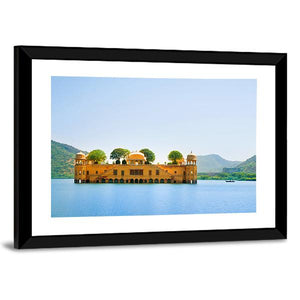 Jal Mahal Panoramic Canvas Wall Art depicts a palace rising from a tranquil lake with domed roofs and tree-covered mountains in the background. Rendered in a realistic, wide-angle composition with blue, orange, green, and white tones, it offers a serene, majestic mood that fits modern living spaces and wall decor.