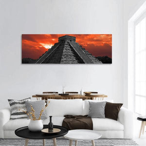 Chichen Itza temple rendered in a photorealistic panoramic view, highlighting the stone pyramid with steep stairs against a dramatic sunset sky. The rule-of-thirds composition and a bold black, white, red and orange palette create an awe-inspiring, mysterious mood that suits modern interiors and room decor.