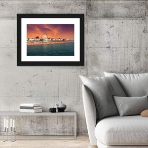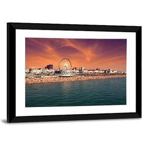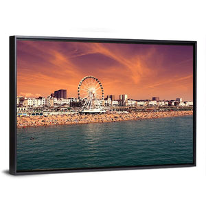 The Brighton wheel rises above a crowded summer beach in this panoramic canvas, rendered in a realistic style. Warm orange and blue tones create a lively, sunny sunset mood that fits coastal or contemporary rooms. The composition follows the rule of thirds to lead the eye across the ferris wheel, shoreline, and buildings.