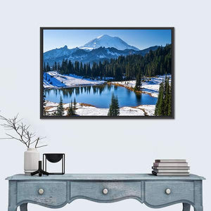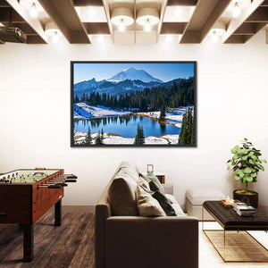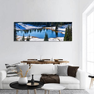 Tipsoo Lake In Winter Panoramic Canvas captures snowy mountains, pine trees and a glassy lake under a clear blue sky. The realistic winter scene feels serene and crisp, a calming choice for modern or nature-inspired rooms.