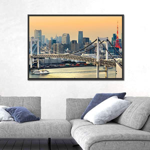An urban panoramic canvas of Tokyo’s Rainbow Bridge and Tokyo Tower, showing the waterfront skyline with bridge cables and tall buildings. Cool blues and grays with touches of yellow and red give the scene a modern, urban mood. It fits contemporary rooms and office spaces with city-inspired decor.