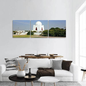 Mazar-e-Quaid, Pakistan appears in a wide-angle, realistic canvas showing the white domed building with red arched doorways, lush green trees, and a clear blue sky. The bright, clear, architectural mood and a white, green, blue, and red palette work well with modern interiors and room decor.