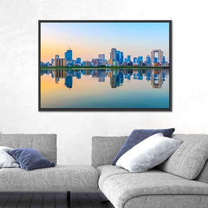 This canvas captures Osaka’s city skyline reflected in calm water, with a notable arched building anchoring the view. The panoramic composition and a blue, yellow and orange sunset palette give the scene a serene, modern mood. It suits contemporary living rooms or offices that want a quiet urban focal point.