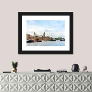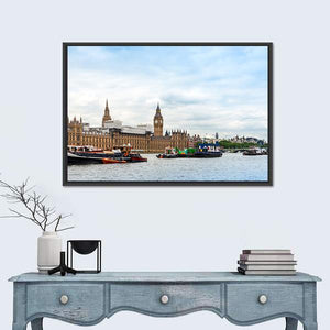 Big Ben in London fills this panoramic canvas with the river Thames, historic buildings and many boats. Rendered in a realistic style, the blues, grays, browns and whites convey a busy, urban, grand mood. It complements living rooms or offices with modern or traditional décor.