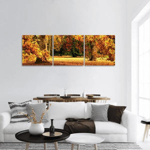 Autumn trees and a leaf‑strewn forest floor set a warm, serene mood in this panoramic canvas, with sunlight filtering through the trees. Rendered in a realistic nature‑photography style and an orange‑yellow‑brown palette, it fits well in modern or nature‑inspired rooms looking for a calm focal point.
