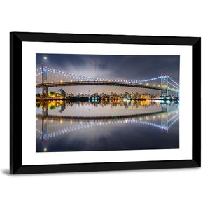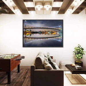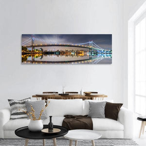 Triboro Bridge in New York at night appears across a panoramic canvas, with bridge lights and city reflections dancing on the water. Deep blues, black, white and touches of yellow create a vibrant, urban nighttime mood. The modern cityscape suits contemporary or city-style interiors.