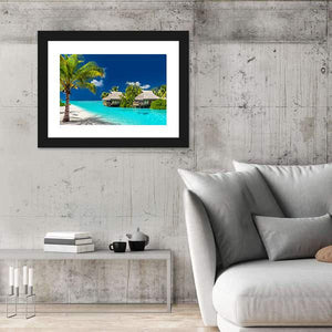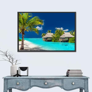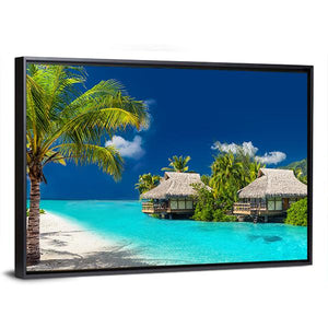Bora Bora comes to life in this panoramic canvas featuring overwater bungalows, palm trees, turquoise water and a clear blue sky. The realistic scene reads tropical and serene, with thatched roofs and palm shadows adding idyllic detail. It works well in coastal or modern rooms that could use a calm, natural focal point.