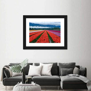 A panoramic view of tulip fields in Chilliwack, with rows of red, pink, yellow and purple blooms beneath a cloudy sky and misty mountains. The realistic, scenic print feels vibrant yet peaceful and suits modern living rooms or nature-themed spaces.