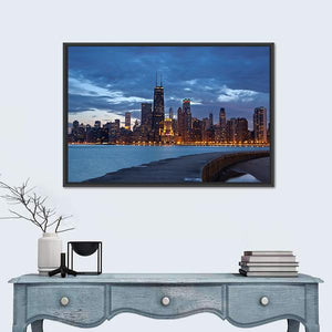 Depicting the Chicago city skyline and waterfront at blue hour, this panoramic canvas features illuminated windows beneath a cloudy, reflective sky. The modern composition uses blue, black, gold and white tones to convey an urban, twilight mood. It suits modern living spaces and city-inspired interiors.