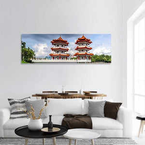 Twin Pagoda China Panoramic Canvas features twin pagodas with orange roofs set beside a calm lake, framed by trees and puffy clouds. The realistic, symmetrical panorama feels serene and cultural, and it works well in living rooms, offices, or entryways with modern or Asian-inspired decor.