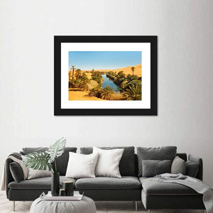 A photorealistic panoramic view of Umm Al-Ma Lake in Libya, showing a desert oasis with palm trees, a winding river and sand dunes beneath a clear blue sky. Its peaceful mix of blue, green, tan and yellow brings a calm, nature-inspired touch to modern living rooms or quiet reading spaces.