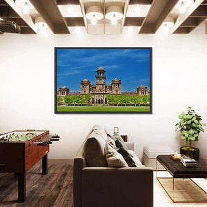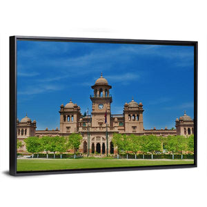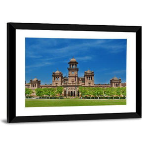 A photorealistic panoramic view of the University of Peshawar, showing its ornate dome, arched windows and a detailed clock tower beneath a bright blue sky. The symmetrical composition feels grand and serene, with tan, green and blue tones that calm the room. Works well with modern room decor—suitable for a study, office, or living area that appreciates architectural landscape art.