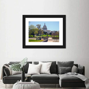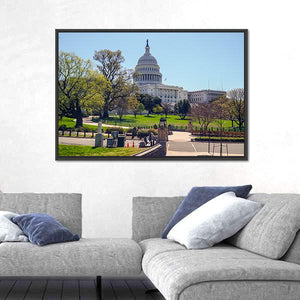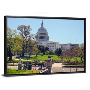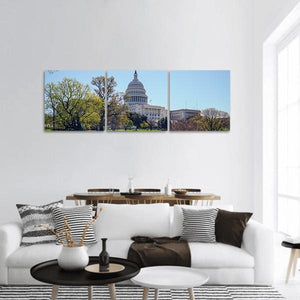 A panoramic canvas of the United States Capitol in Washington that highlights the prominent dome and the spring foliage along the grounds. Rendered in blue, white, green, and brown tones, the realistic cityscape feels grand, serene, and quietly patriotic and suits modern room decor.