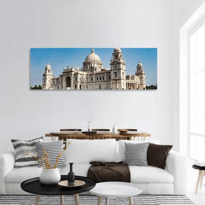 Victoria Memorial in Kolkata is presented as a panoramic canvas print, shown in realistic architectural detail with its large dome, towers, and classical columns under a clear blue-and-white sky. The image has a majestic, historical mood and works well in modern or architectural interiors.