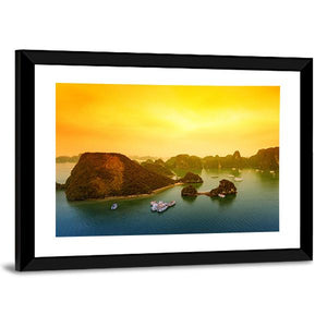 This panoramic canvas captures Halong Bay, Vietnam at sunset, with lush green islands, numerous small boats, and a sky washed in orange and blue. The scene feels serene yet vibrant and suits modern living rooms or spaces seeking nature-focused wall art.