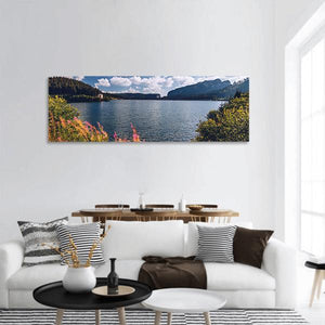 This panoramic canvas depicts a view to Bolboci Lake in Romania, featuring calm water, forested hills, distant mountains, scattered clouds and vibrant wildflowers. The realistic nature photograph feels serene and vast, with a blue-and-green palette that brings a natural calm to modern and nature-inspired interiors.