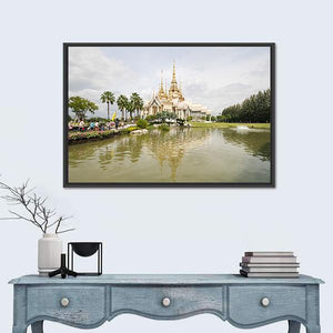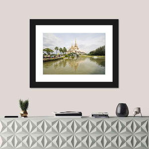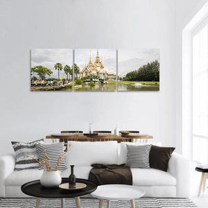A panoramic canvas of Wat Non Kum Temple in Thailand, showing an ornate golden temple reflected in calm water and framed by lush green trees. The scene feels serene and grand, with small figures of people adding scale — a quiet focal piece for a living room or meditation space.