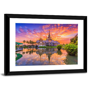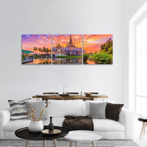 This panoramic canvas captures Wat Thai temple in Thailand at sunset. Ornate temple architecture, palm trees and a dramatic purple, orange and gold sky reflect calmly on the water, creating a serene, vibrant, and peaceful scene. It suits living rooms, meditation spaces, or modern interiors with tropical or Buddhist-inspired decor.