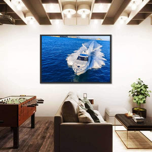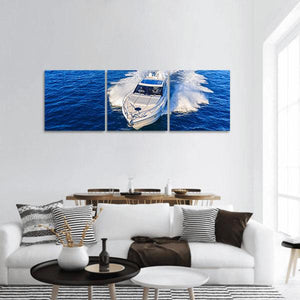 Capture the refreshing essence of the ocean with this striking canvas artwork featuring a speeding yacht amidst dynamic waves. Its vibrant blue and white palette, coupled with photorealistic detail, creates an energetic atmosphere that enlivens any space.