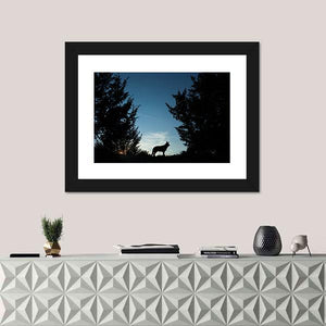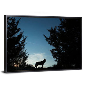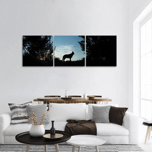 A wolf dog silhouette stands on a grassy hill against a dusk sky, the sunset glow keeping the scene calm and watchful. Black and blue tones with touches of white and orange create a minimalist, peaceful panorama. Ideal for modern or nature-inspired rooms.
