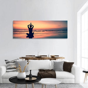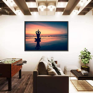A silhouetted woman practices yoga on a beach at sunset, with the sun reflecting on calm water. The symmetric composition and warm orange, pink and blue tones create a serene, meditative mood. Fits modern or minimalist rooms and quiet yoga or meditation corners.