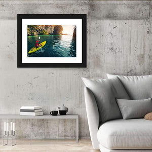 A kayaker glides across rippling water in this panoramic canvas print, with a yellow kayak and a person in a red hat. The image blends calm and active energy through blues, greens and sunlit whites, suiting modern, nature-inspired living rooms or hallways.