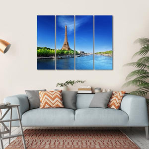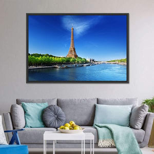 This canvas art beautifully captures the Eiffel Tower surrounded by a scenic cityscape. The bright blue sky and realistic depiction of the urban landscape evoke a clear, sunny day in Paris, making it a perfect addition to your wall decor.