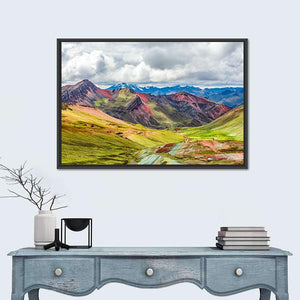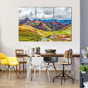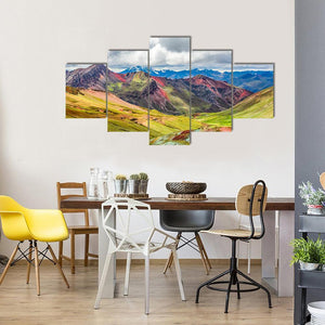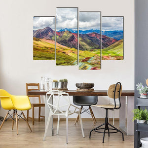 This canvas art features a breathtaking view of the majestic Rainbow Mountain in Peru. The vibrant colors of the mountain range and valleys capture the natural beauty and dynamic atmosphere of the landscape.