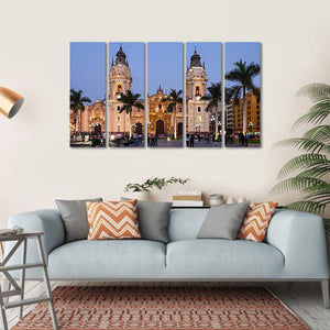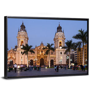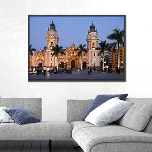This canvas wall art captures the majestic Basilica Cathedral of Lima, showcasing its ornate facade and twin bell towers. The vibrant colors and peaceful evening ambiance create a welcoming atmosphere that adds character to any space.