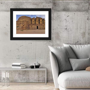This canvas art features the majestic facade of an ancient building set against a rugged rock cliff in a desert landscape. The realistic portrayal captures a historic and grand atmosphere, perfect for adding depth to your wall decor.