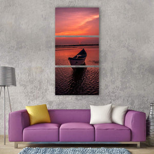 A boat on a calm sea at sunset, rendered in warm oranges and pinks that blend into blue and brown tones. The realistic scene uses a rule-of-thirds composition and includes a small dolphin decal on the boat, creating a serene, tranquil atmosphere. Works well in coastal or modern room decor.