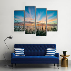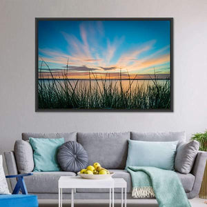 Blue Sky & Sunset Over Lake shows a serene lakeside landscape with tall green grass in the foreground, calm water, and long-exposure clouds. The rule-of-thirds composition and a blue–orange–green palette create a calm, peaceful mood that suits modern, minimalist interiors.